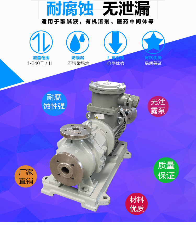 WJC不銹鋼磁力泵過流部件采用全不銹鋼材料(304、316、316L),內(nèi)、外磁轉(zhuǎn)子選用高磁能積、高矯頑力的稀土永磁制造,具有高效節(jié)能、介質(zhì)適用面廣、耐高溫、磁性強(qiáng)、不退磁等優(yōu)點(diǎn),對有機(jī)酸,有機(jī)化合物,堿,中性溶液和各種氣體都有良好的耐蝕性,雙螺旋糟碳石墨軸承和硬質(zhì)合金軸套,具有較強(qiáng)的耐磨性,是應(yīng)用磁力耦合實(shí)現(xiàn)無接觸傳動(dòng)、無動(dòng)密封的新型高品質(zhì)磁力化工泵。保證了產(chǎn)品的壽命,是無泄漏輸送腐蝕性介質(zhì)的理想用泵。