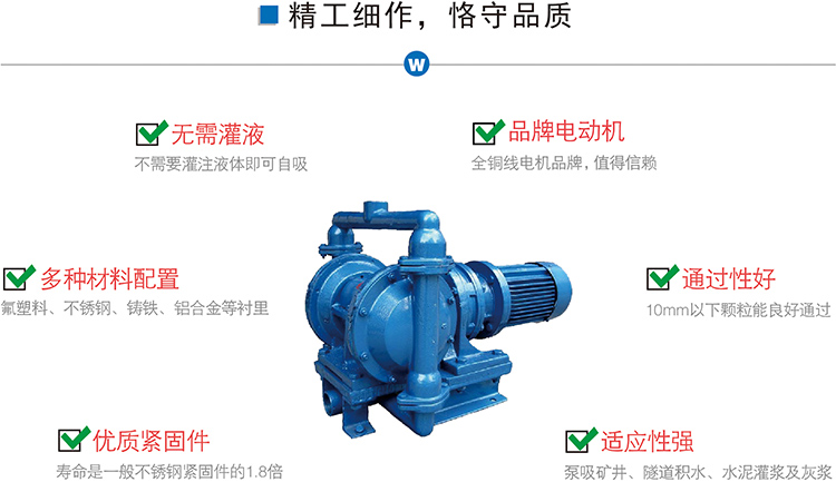 DBY 型電動隔膜泵是 一種新型的泵類。本泵應用于石化、陶瓷、冶金等行業(yè),這種泵的主要特點是不需灌引水。直徑 在10毫米以下的顆粒、泥漿等均可以毫不費力地通過。由于隔膜將被輸送介質和傳動機械件分開,所以介質不會向外泄漏,且泵本身無軸封,使用壽命大大延 長。根據(jù)不同介質,隔膜分為氯醇橡膠、氟橡膠、丁晴橡膠等,可以滿足不同用戶的要求。