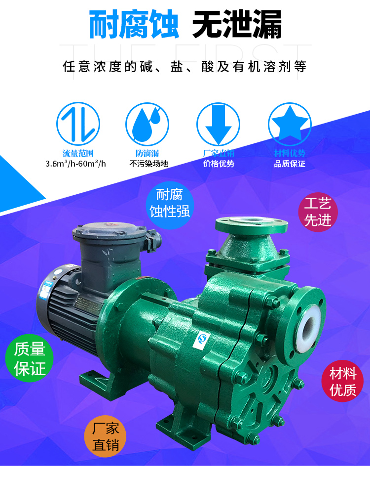 氟塑料磁力自吸泵又稱其為氟塑料自吸磁力泵、襯氟磁力自吸泵、耐腐蝕自吸化工泵,ZMD襯氟磁力自吸泵具有磁力泵和自吸泵的特性,同時兼具良好的自吸功能。按照國標設計研發可以輸送低位介質、罐車原料裝卸、氣液混合介質。過流部件緊襯氟塑料,泵體為金屬材料,能夠承受管道重量。取消軸封,利用磁力間耦合驅動,不會滴漏現象,保障工況安全生產。